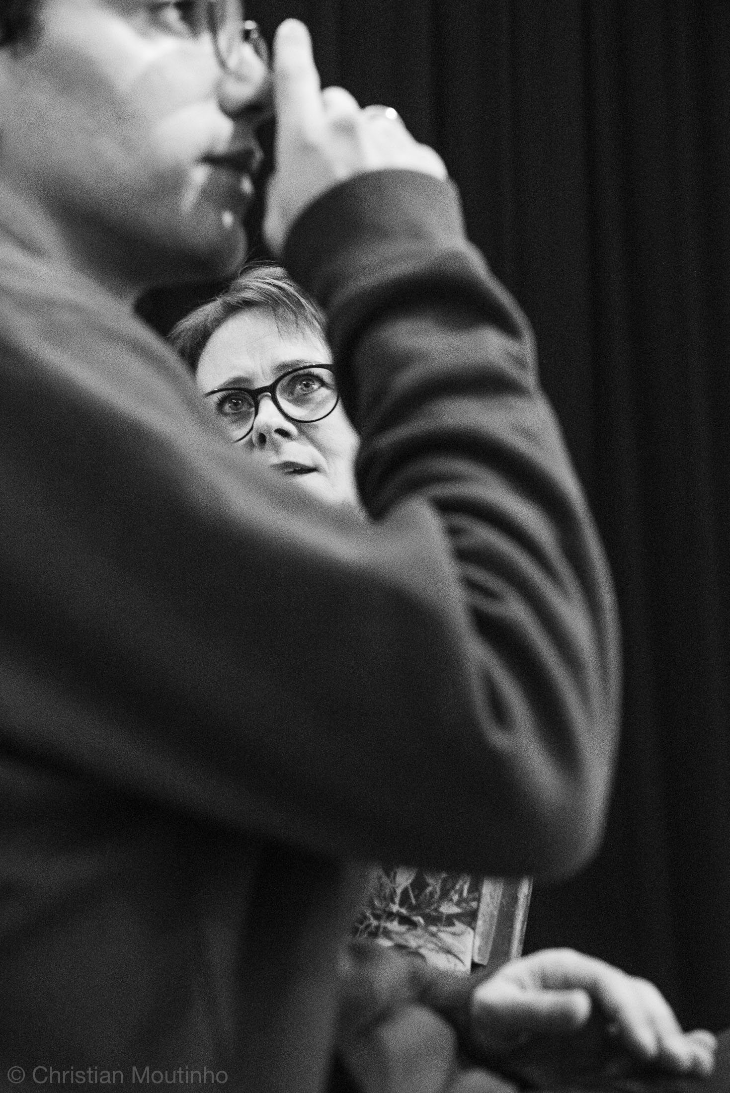 Les salles où se déroulera le spectacle sont de dimensions variées: local de répétition comprenant une scène au sous-sol; vaste espace muni d’un bar au rez; petite cafétéria au premier étage, etc. Dans un lieu à chaque fois différent, devant un public composé tantôt d’au maximum quinze ou quarante spectateurs, selon le soir de représentation, les deux comédiens auront à tenir – et inventer – la bonne distance de l’un à l’autre. Pas de coulisse non plus, ni de loge où enfiler un nouveau chandail ou se recoiffer: la frontière entre acteur et personnage sera ici perméable.